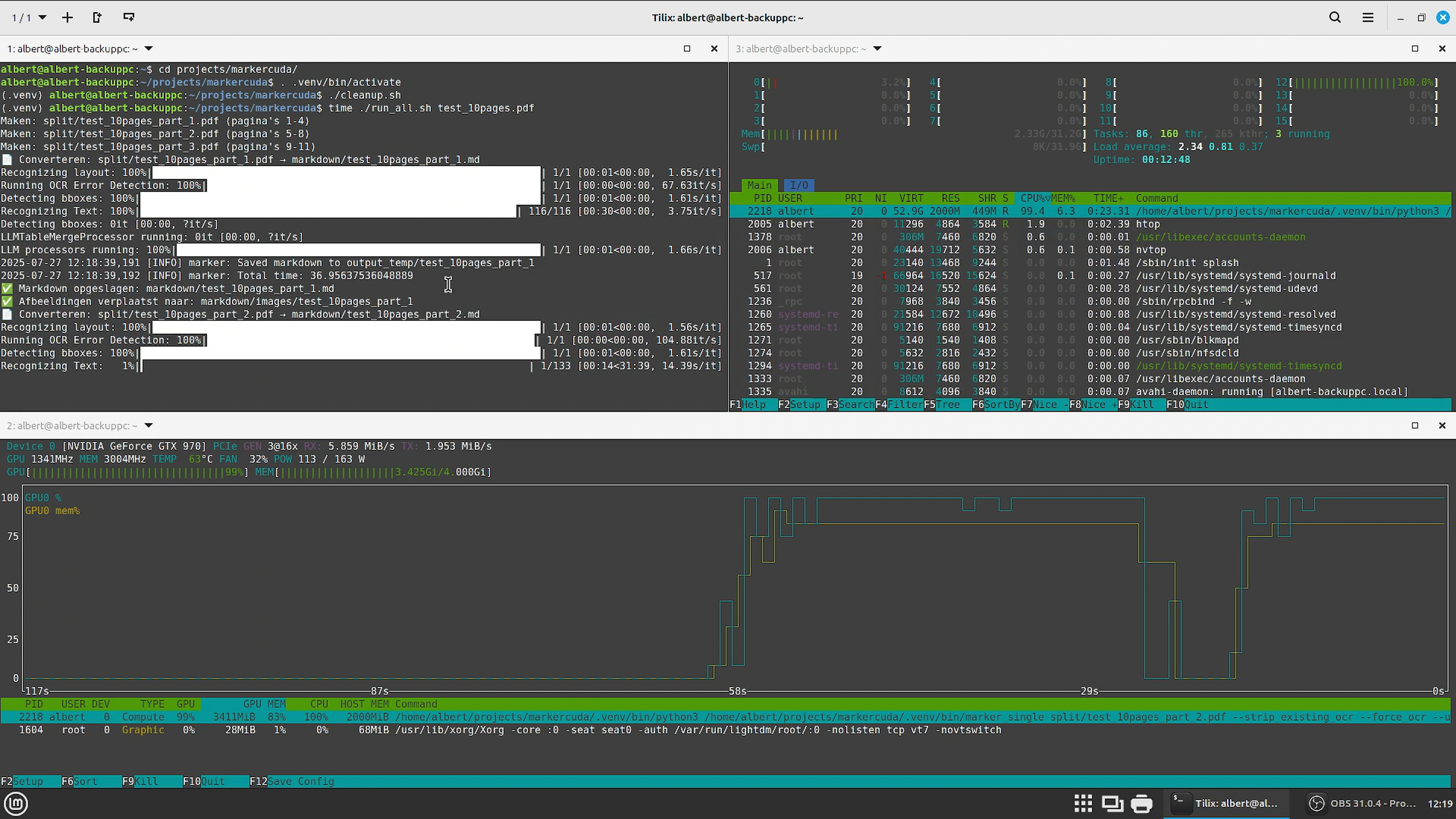 I could choose to not use a GPU and run on CPU only as I have plenty of system Ram. One book is still to much for the amount of Ram I have, but in stead of dividing in pdfs of 4 pages I could probably use pdfs of 50 pages. That would mean a lot less manual cleanup. Obviously though the conversion would take a lot longer, but as I don’t have to babysit this process it might make sense. So I did some tests.